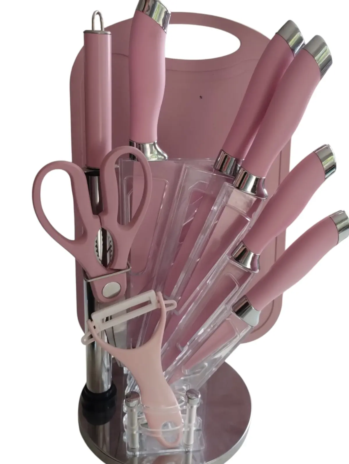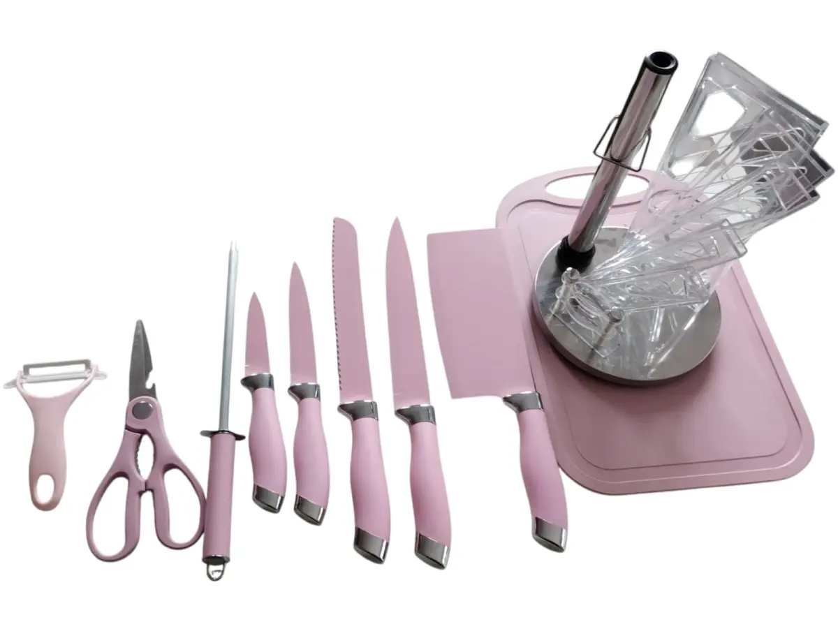 Elegante y completo set que incluye cuchillos esenciales, tijera y pelador, todo organizado en un moderno soporte. Diseño cómodo, resistentes y fáciles de limpiar. Perfecto para cocinar con practicidad y estilo todos los días.