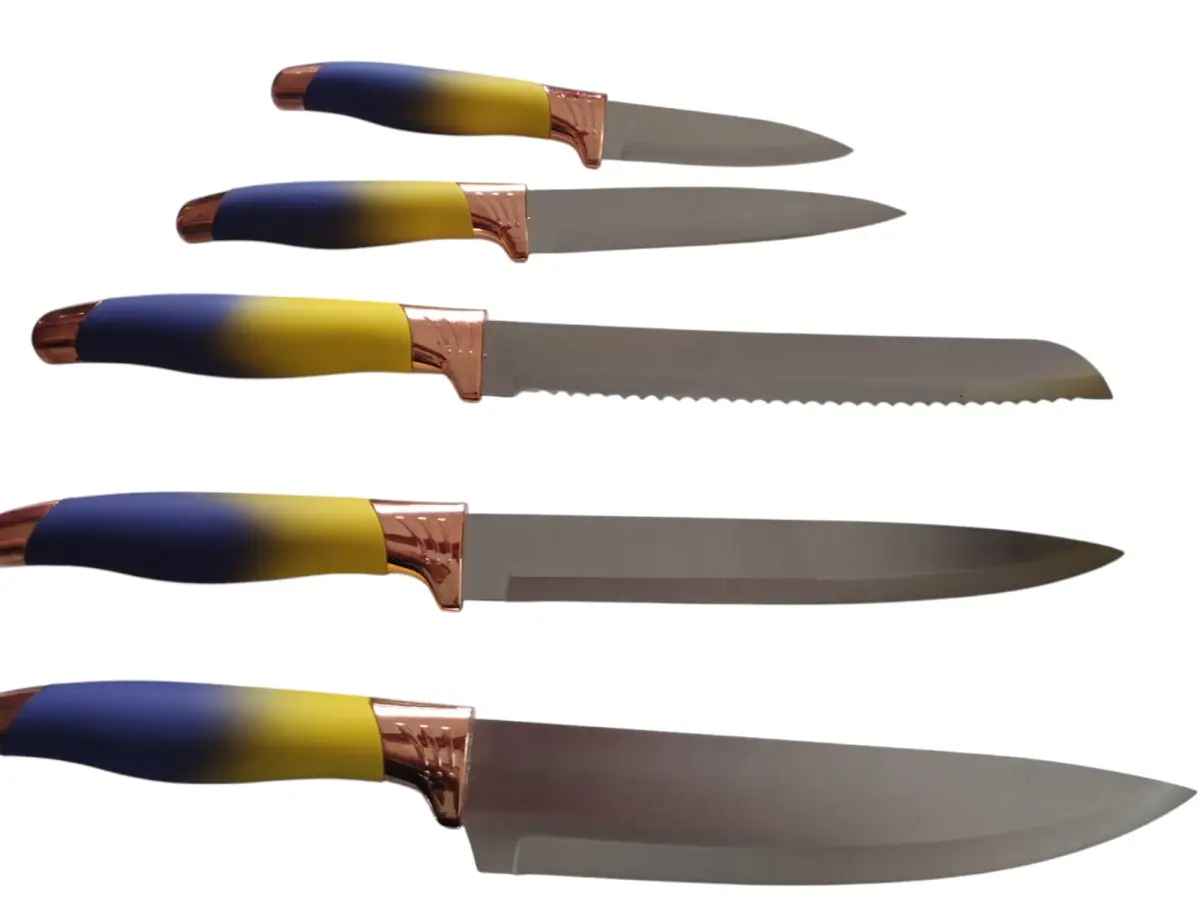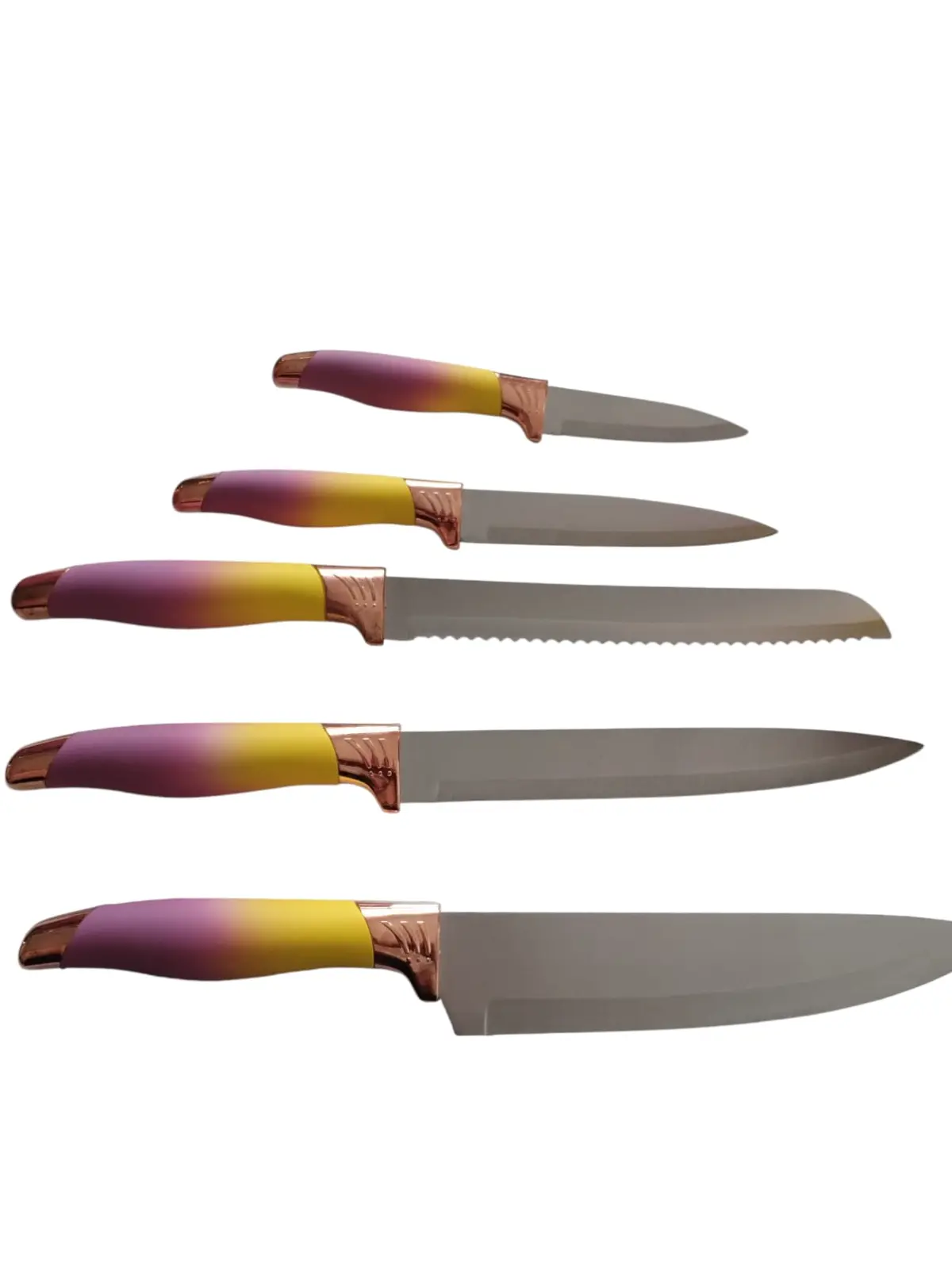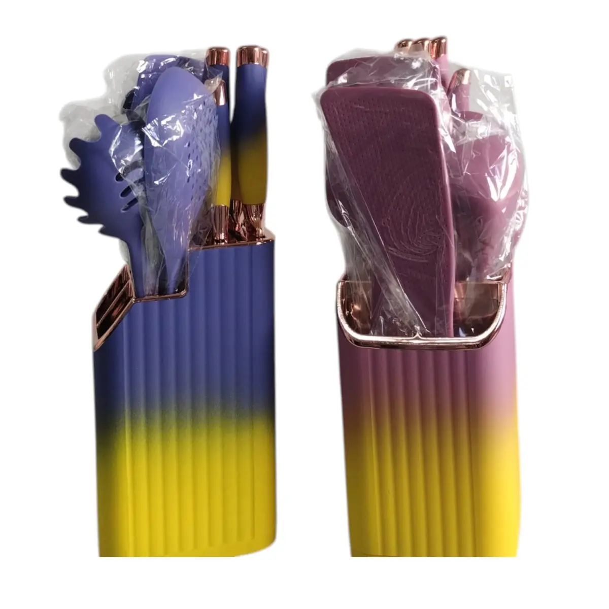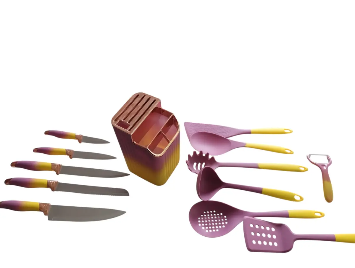 Transformá tu cocina con este set completo y elegante que reúne cuchillos afilados y utensilios esenciales en un práctico soporte organizador. Diseño moderno en degradé, cómodo de usar y fácil de limpiar. Ideal para cocinar más rápido, ordenado y con estilo.